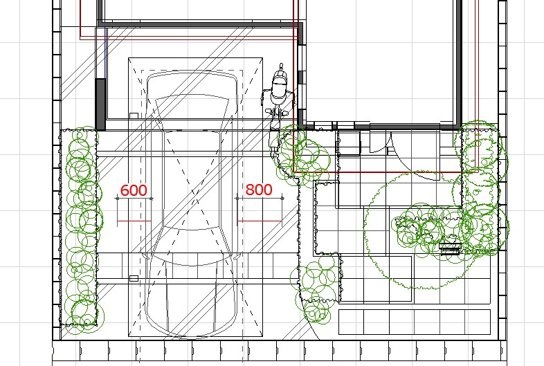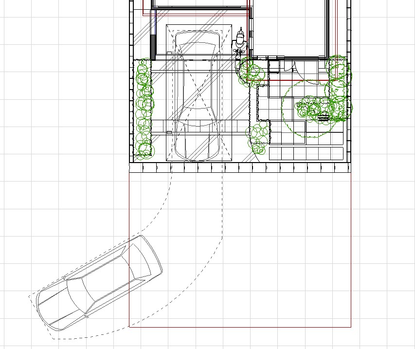 まず、出し入れのしやすさについては、前面道路の幅や駐車場の間口によって、車が描くカーブの軌跡が変わります。柱がその軌跡に干渉しない位置にあることが大前提です。