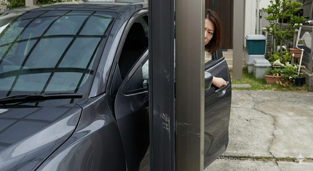 もっとも多いのが、駐車した際にちょうど運転席や後部座席のドアの真横に柱がきてしまうケースです。ドアを全開にできず、体を細めて乗り降りしなければならなかったり、子供や高齢者の介助が困難になったりします。「少し前後にずらして停めればいい」と考えていても、毎日のこととなるとその微調整が大きなストレスに変わります。