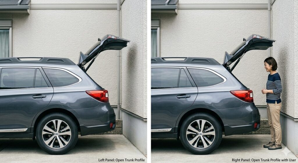 柱の位置を前後に調整する際は、後ろ側のチェックも忘れずに。バックドアを跳ね上げたときに屋根や柱が干渉しないか、あるいはトランクから荷物を出すときに柱が足元の邪魔にならないか。